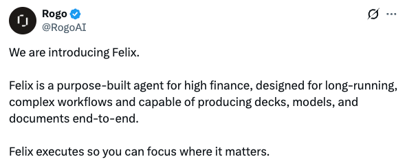 Rogo announced Felix, an AI agent designed to handle end-to-end financial research tasks, including sourcing data, analyzing companies, and generating structured insights for analysts and investment teams. Rather than acting as a simple assistant, Felix is positioned as a workflow operator that can navigate datasets, pull relevant filings, and synthesize outputs across multiple steps. The focus is on reducing time spent on repetitive research and allowing analysts to move faster on decision-making.